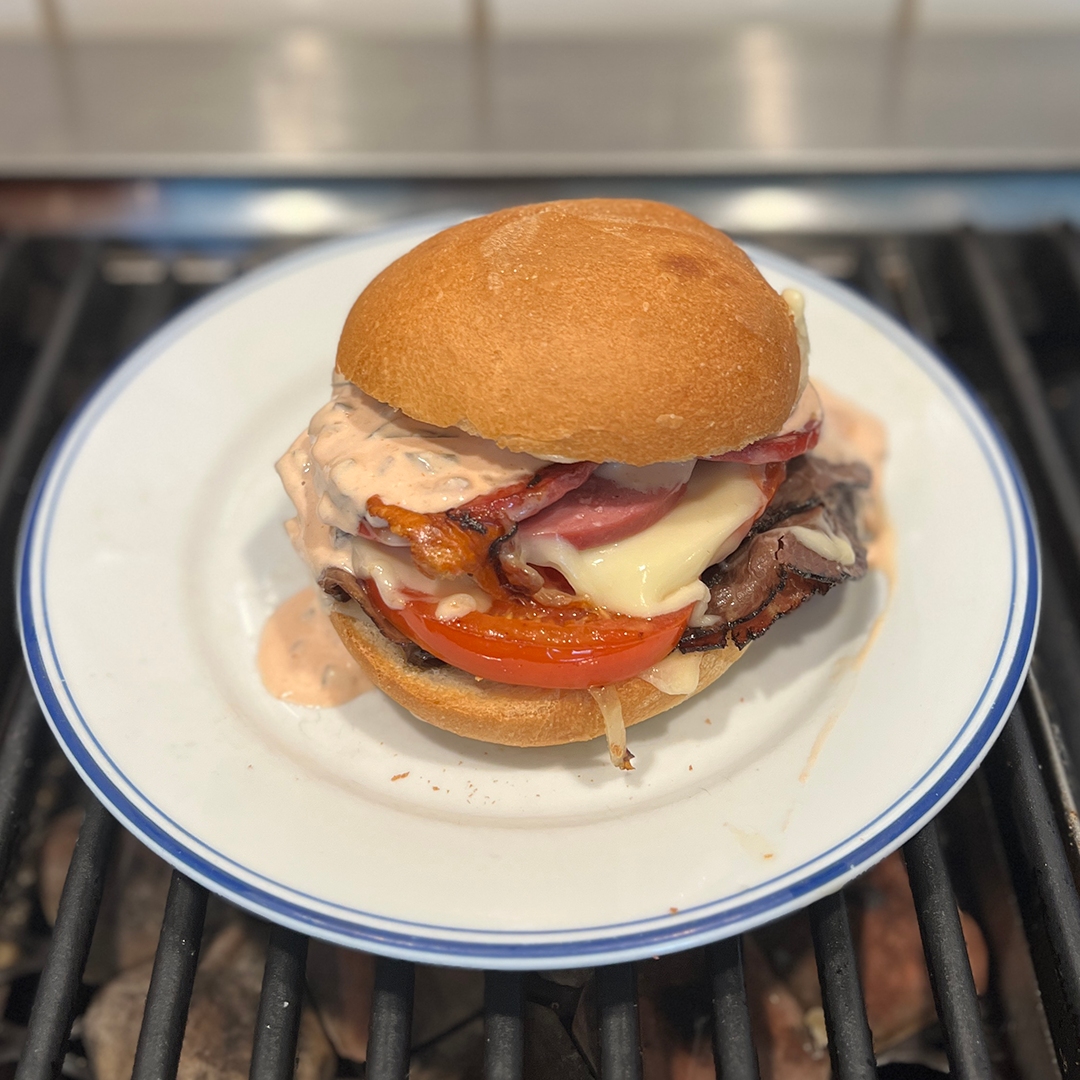 This was one hot mess of a sandwich. A tasty hot mess, but a hot mess nonetheless. I followed this recipe but have been informed by some folks that they use thinly sliced ribeye. That’d work too. Once thing I dug about his sandwich was the process. Cooking sliced roast beef on one side of the pan, onions on the other. Then flipping the onions and the beef then stacking the beef on top. Same goes for the cooked salami treatment. Adding a little color to meat really does bring some flavor. Combine it all with tomatoes, American cheese from the deli, and that burger sauce and man, that was a flavor bomb. Plussed it up with some pickled jalapeños for pop and a little heat. Yum. Oh and according the bar that created it, the sandwich is not named for famous Phillies third baseman Mike Schmidt.