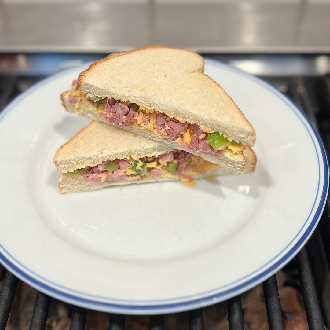 Another great Sandwiches of History guest host! This time professional touring drummer Mike Robinson. In addition to being a professional drummer, he’s into food. So much so that he brought both of those passions together to create the Food On Tour Podcast. Speaking of which, your’s truly will be on Monday, June 24th, 2024 to chat about New Orleans Sandwiches. Listen on his website, Spotify, Apple Podcasts, or wherever you get you podcasts. Mike took on the Honey Nut Sandwich from 1936’s 1,001 Sandwiches. And boy did he go all in. First, plussing it up with crushed graham crackers and pretzel rods he had leftover from making his sun a s’mores pizza the other day (what a cool dad!!). Then remix the recipe with Mike’s Hot Honey. Creative and smart.