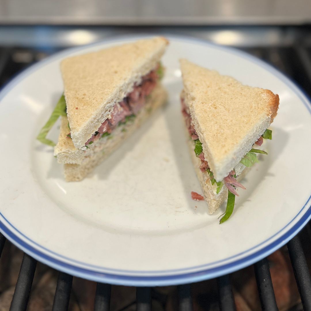 What was odd about this sandwich is how it flirted with club sandwich materials but structured it in a different, if not odd, way. Unusual, too, was the call for Romaine lettuce. But the combo of ham, chicken, and mayo on toasted bread was still pretty good. Plussed up with a little chili powder and a slice of tomato made it a little more ok? Yeah, won’t be making this one again.