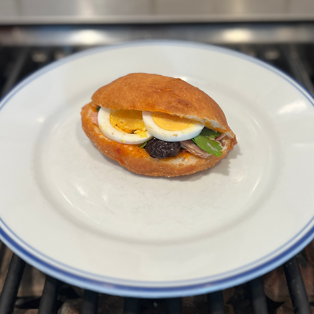 Oh man, another absolute banger of a sandwich. The deep frying of dough was the only part that was slightly daunting but it turned out great. While not exactly the same, this felt like a close cousin to the Pan Bagnat, another delicious salad as a sandwich from France. The bread as slightly crispy on the outside, light and fluffy on the inside which really allowed me to pack in the potatoes, harissa, dry cured olives, tuna in oil, hard boiled egg, and parsley. It really wanted for nothing in my opinion. Just a tasty little number all around.