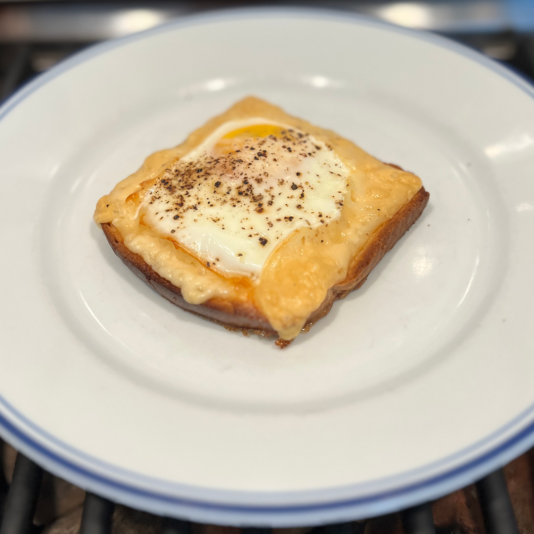 This was a fun little number. We toasted the bread on one side, buttered the other, then made a Swiss cheese frame for an egg. My only nit is that the 15 minutes of baking called for in the recipe ensure a yolk that wasn’t runny. Other than that it was tasty. For the plus up I went full brunch by adding bacon and Pepper Plant Hot Sauce. That hot sauce, which is made with jalapeños, dehydrated onions, and dehydrated garlic, has a nice depth of flavor. And if I have to tell you why bacon is tasty and worked well here, you may need to see your doctor.