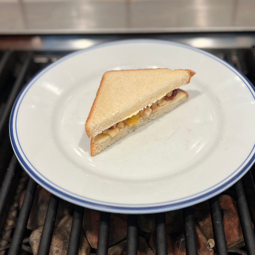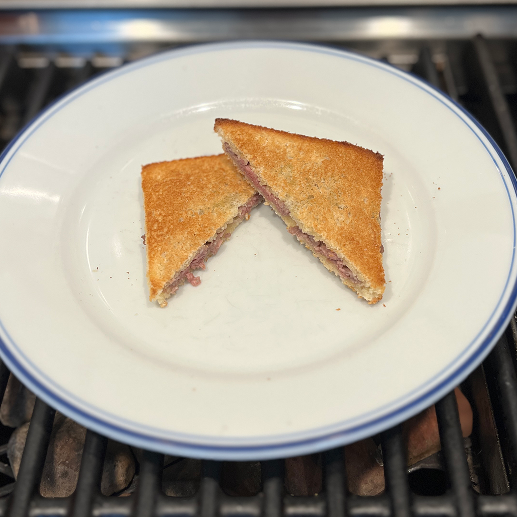 I saw this sandwich on Pete (Living History UK)’s TikTok account and I just had to try it. I have a soft spot for canned corned beef as my dad used to cook that and canned corned beef hash for weekend breakfast from time to time. That said, I hadn’t eaten it cold before. Nor had I had it with slabs of cheddar cheese and jam. Like Pete, I couldn’t find the plum apple jam originally used. And also like Pete, I used strawberry jam. No regrets. It was tasty. But I knew heating it up would make it even more so. Allowing the fats of the cheese and the corned beef to start intermingling while providing a crunchy exterior.