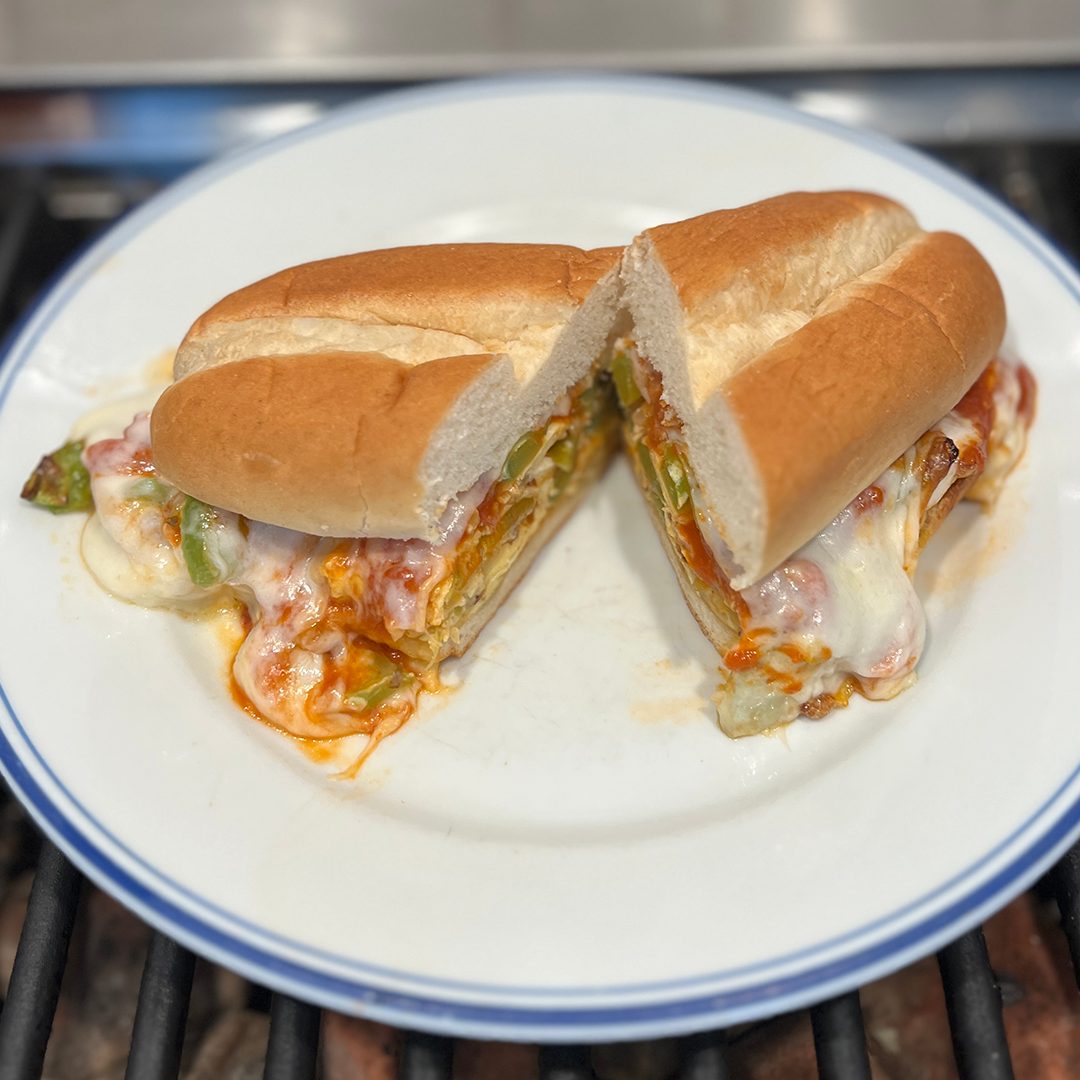I love sandwich recipes like this. Written in typewriter and entered into a compendium of community recipes by a PTA. In this case the PTA from P.S.1 in Tottenville, Staten Island, New York. basically, a cross between a cheesesteak and an eggplant parmesan sandwich, this was destined for glory from the get-go. This is one of those time when I say that I think you know exactly where I am going with the plus up. To me, chili flakes seemed to be the only choice. Yet, a lot of folks comment that they did not see that coming. Shows you what I know. Lol.