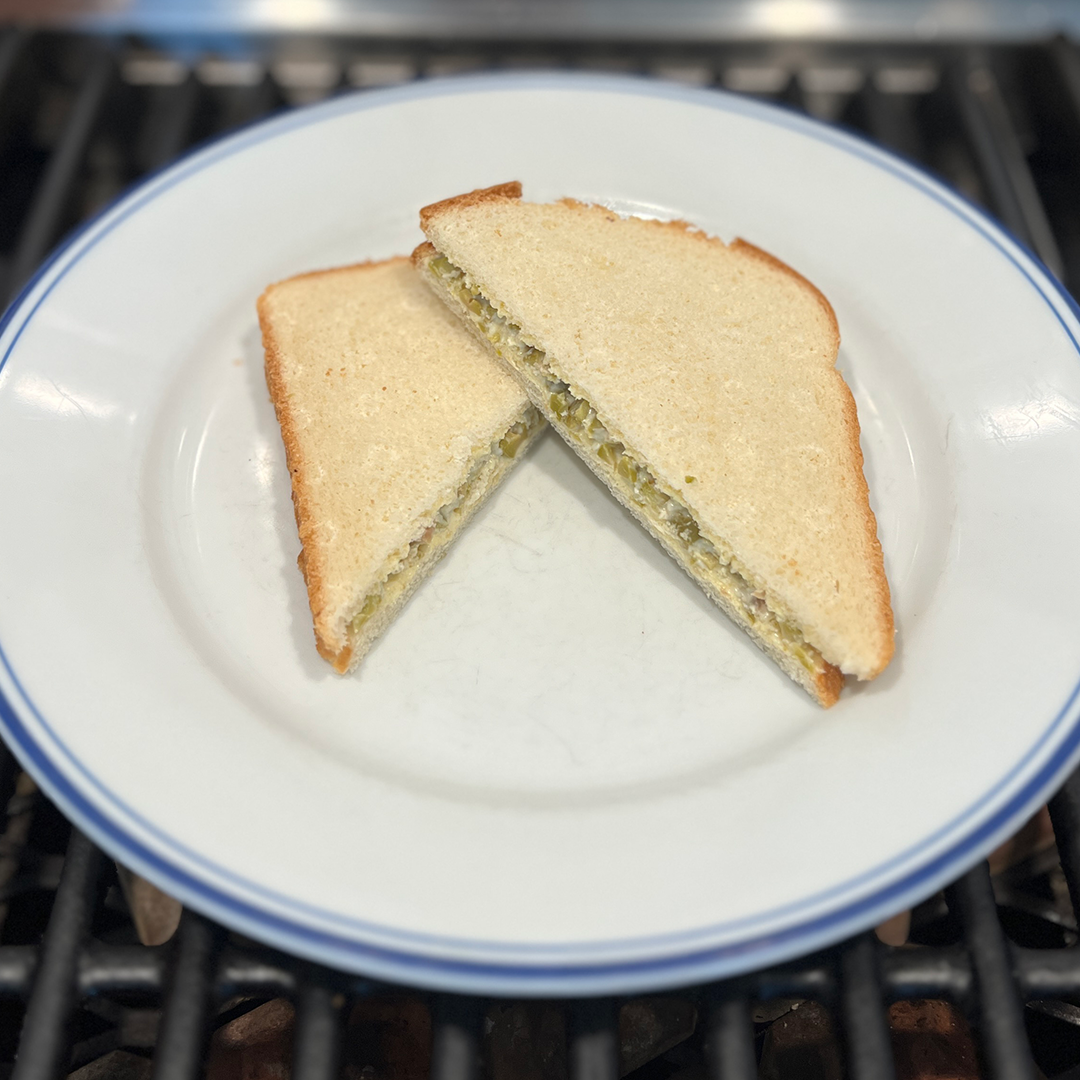 This Olive Sandwich was different than most that I’ve done. Most call for either adding chopped green olives to cream cheese or just adding chopped green olives to buttered bread. No, this one had me soak the olives in boiling hot water for five minutes, then soak in ice water until crisp. As I mention in the video, it is highly likely they were using olives that I do not have access to. And it seems like that odd process might have been to aid in the freeing of the meat from the seed. At any rate, the original sandwich was exactly the sum of it’s parts. So I plussed in up in a slightly Mediterranean direction with garlic powder (I though raw would be too overpowering) and lemon zest. Brightened things right up!