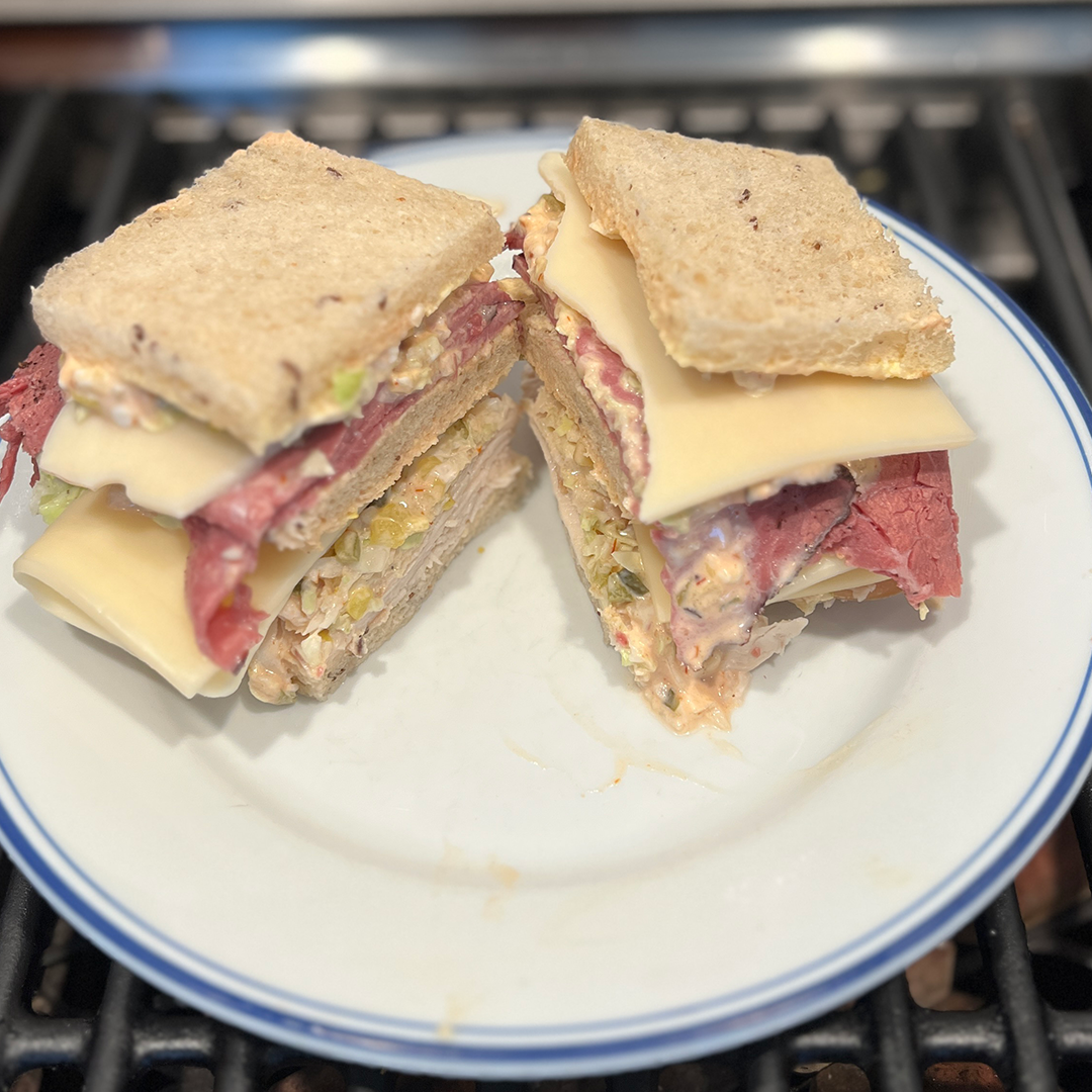 The New Jersey Sloppy Joe has been on my “to do” list for a long time. Decidedly not like the typical Sloppy Joes, it is a deli staple in a very small part of New Jersey, apparently. I say that because soooo many folks who claim to have lived in New Jersey their entire lives said that they’d never heard of it. Go figure. The sandwich allows for options when it comes to meat and I opted for pastrami and turkey. It’s got everything you want in a deli sandwich. From the caraway in the rye bread to the meat to the tanginess of the Russian dressing to the slightly sweet cole slaw and nutty Swiss cheese. Highly recommend you give this a go. Here’s the recipe I followed.