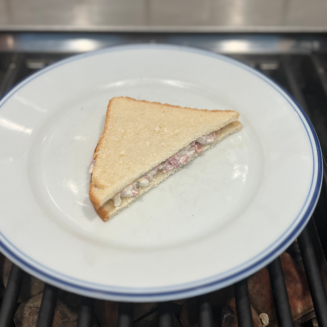 It’s been a while since we’ve done a sandwich from 1912’s Mrs. Rorer’s Sandwiches. While I found it a little unusual to mix in an egg to melted cheese, the resulting sandwich was tasty albeit not very complex. Added a little pickled okra for pop and shoestring potatoes for crunch. I may not make this sandwich again but I will definitely be giving a grilled cheese with pickled okra a go.