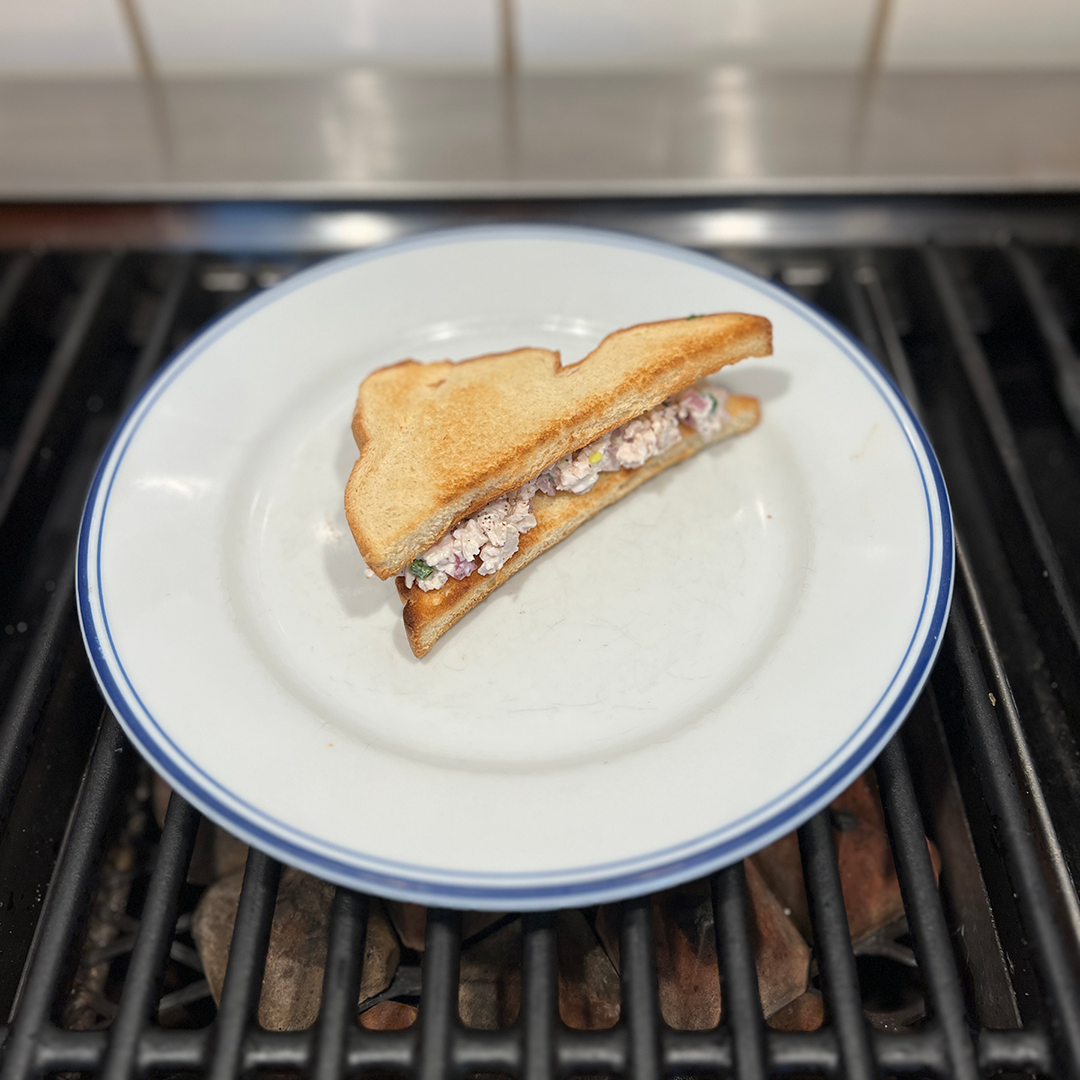 Onion-forward. That would be the best way to describe the flavor of this sandwich. But it wasn’t all onion as there was chopped chicken and rich mayonnaise. And, since it already had animal protein on it and the name of the sandwich was abstract, I hauled off and added bacon and tomato. You rarely see me using bacon to plus up a sandwich because let’s face it, it could do so for just about every sandwich. Plus, it has such a strong presence flavor-wise that it can easily take center stage. Here it played really nicely with the chicken, mayonnaise, and oniony flavors.