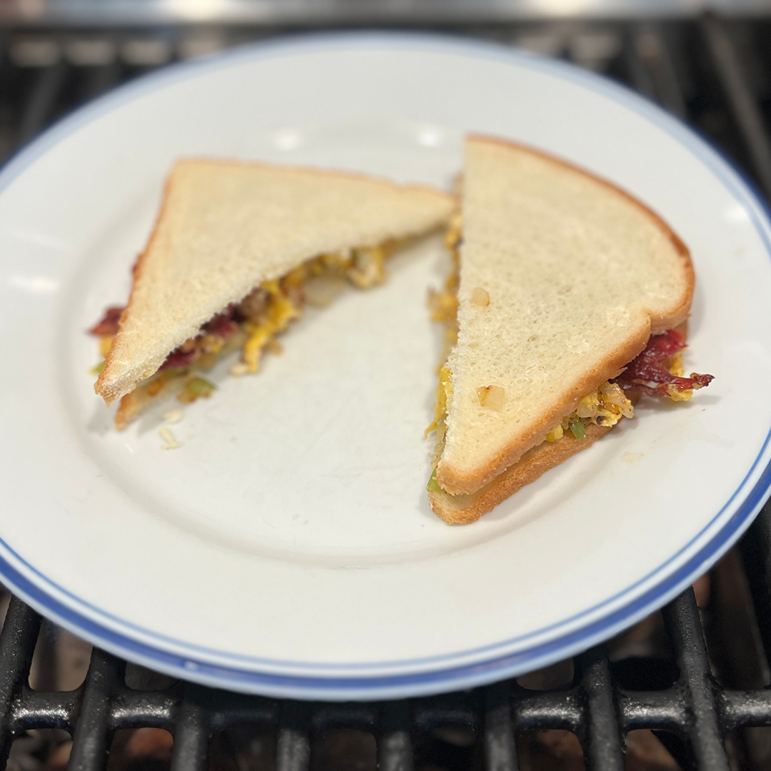 I mean, come on, right? How could this have been bad? Bacon, onion, green bell pepper, and egg cooked in bacon fat. So good. Made even better with The Pepper Plant California hot sauce (affiliate link, just sayin’). It has jalapeños, dehydrated onions, dehydrated garlic, and more and just goes great with all the ingredients in this sandwich. Their habanero version is also excellent.