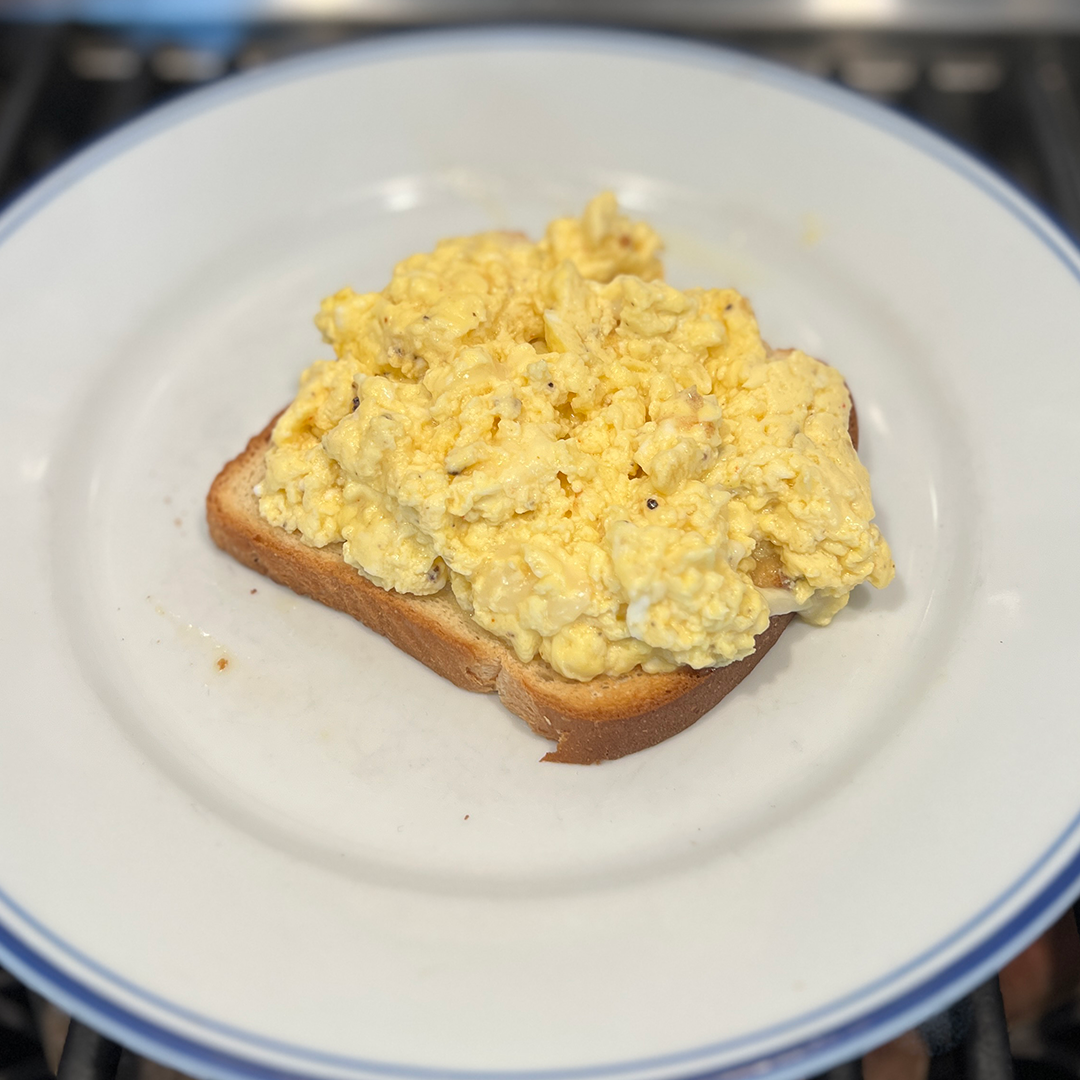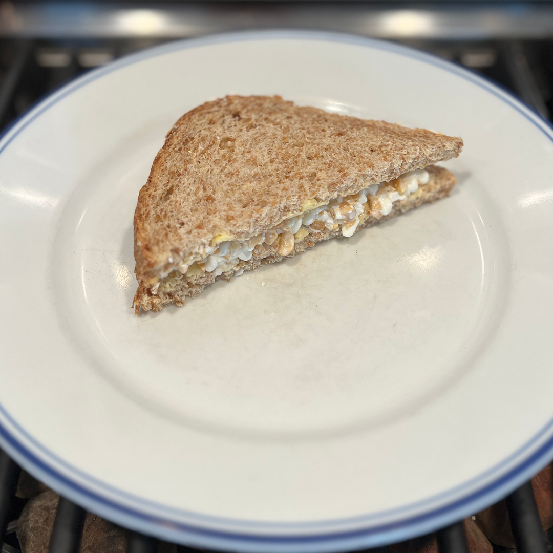 This sandwich was basically cheesy scrambled eggs on toast. Can’t hate that at all, really. Some folks suggested I should’ve cooked the scrambled eggs in a French style so that they were more creamy. Others suggested that a ten cents of cheese in 1935 would’ve been a lot more cheese. And both ideas may be right. We’d still have scrambled eggs with cheese which is not really akin to a cheese sauce in my opinion. Plussed it up with a little seasoning and avocado and then made it more portable with a second piece of toast. No regrets.