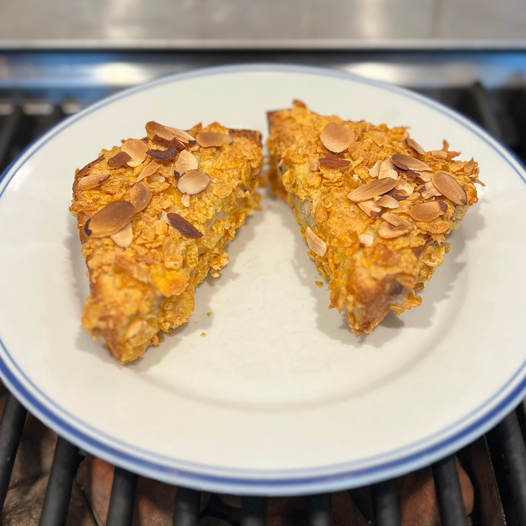 This recipe definitely read like it was geared for busy military parents. And let’s face it, military significant other is holding down the fort while the other is deployed, they are doing everything. Which means they are more than busy. This recipe leveraged easy to get ingredients (e.g. condensed cream of mushroom soup, corn flakes) and didn’t involve a tone of prep time. Plus it had tuna! The end result was a comfort food sandwich that had a nice creamy interior and crunchy exterior. The sweet Thai chili sauce worked as well with the cereal on the outside as it did with the tuna and soup on the inside.