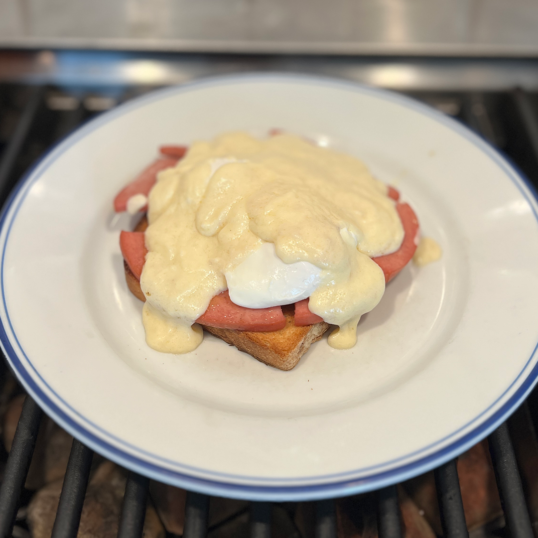 This was fun to do. My friend Jim Behyemer, the man behind SandwichTribunal.com and SandwichIdiot, was researching alternate versions of Eggs Benedict when he stumbled upon this wartime version. It uses bologna instead of ham and a béchamel of sorts instead of hollandaise. Still, it was tasty. Adding the green onions and Franks RedHot Dill Pickle Hot Sauce (affiliate link) really perked things up.