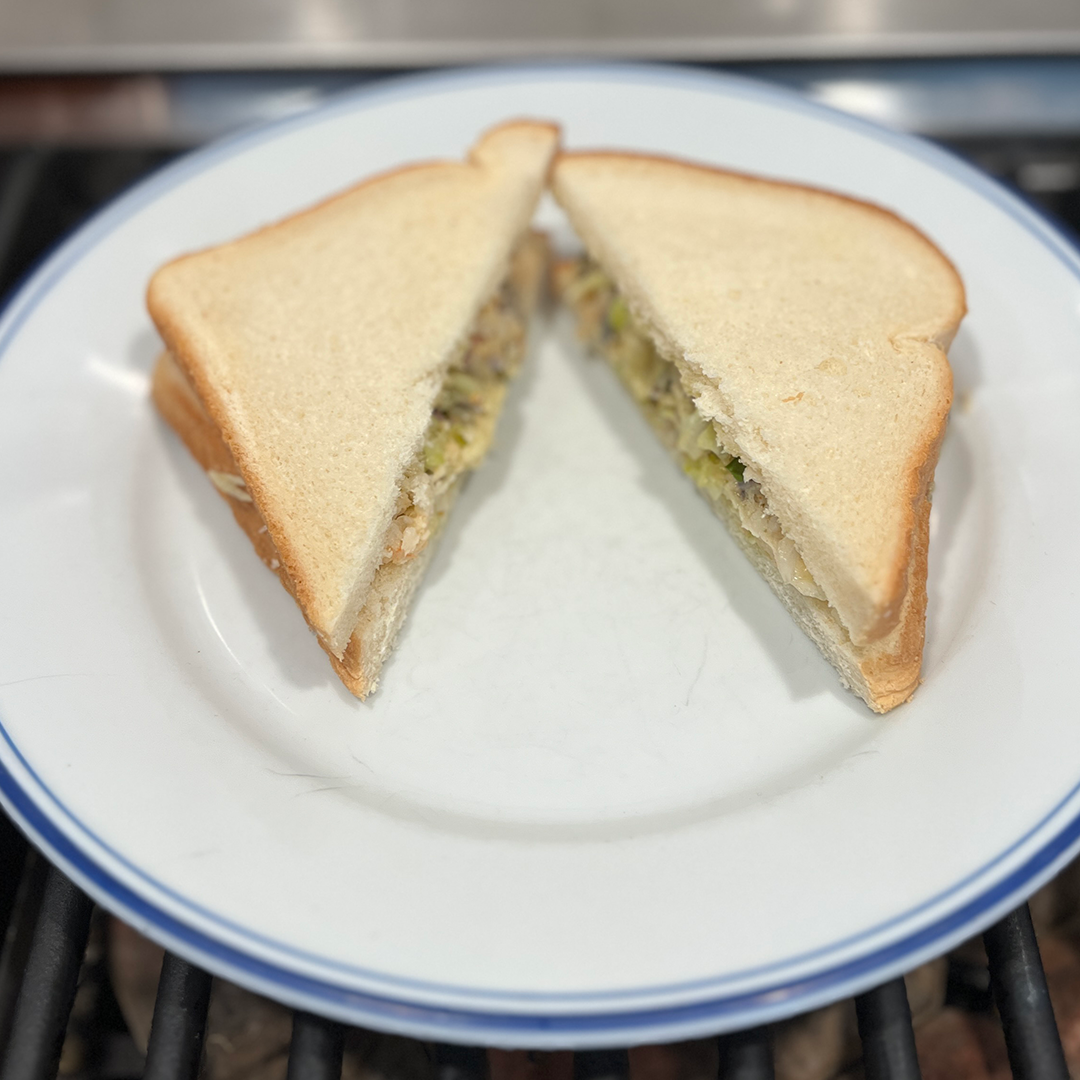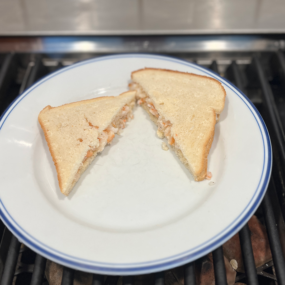 Welcome to the least imaginative named sandwich ever. On the flip side, you know what you’re in for. The cookbook was published in Portland, Oregon. And while that’s not exactly on the coast, it is close enough that I wondered if they meant us to use fresh shrimp, oysters, and sardines or tinned. Given that it was 1914 and a sandwich, I chose tinned. With that “French Dressing” (aka vinaigrette) it was a nice lovely seafood sandwich. Most of the time, I know what I want to plus up a sandwich with when I first read the ingredients. In this case, I had to toss my original idea, J.O. Spice (like Old Bay but more intense) out the window as it wouldn’t really go with the vinaigrette. So I opted for toasted sesame oil and to be honest I wasn’t sure if it would work. But boy did it. It brought a nice nutty flavor that worked well with everything in there. Go figure. I guess even a stopped clock is right twice a day.